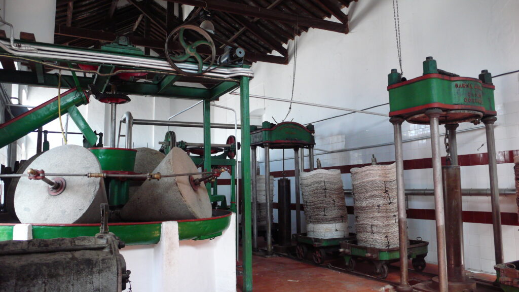 Compuesto por un moledero de cuatro piedras cónicas, seguido de un extractor parcial en frío por el sistema Acapulco y con carácter previo a la fase de prensado, un nuevo batido en termobatidora vertical. La presión es realizada por dos prensas hidraúlicas, el caldo oleoso obtenido reposa en albercas para su decantación natural. El aceite obtenido se almacena en tinajas y trujales.